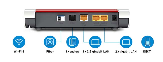 FRITZ!Box 7690 collega i dispositivi della tua rete con Internet via FIBRA FTTH. Con la tecnologia Wireless 7 la trasmissione dei dati è più potente, fino a 5.760 Mbit/s (5 GHz) e fino a 1.376 Mbit/s (2,4 GHz)